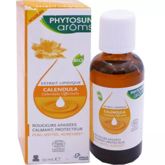 Extrait lipidique calendula Bio de Phytosun Arôms, permet de réparer et d'apaiser les peaux agressées en douceur. Il nourrit la peau et la protège des sensations d'inconfort et des rougeurs.